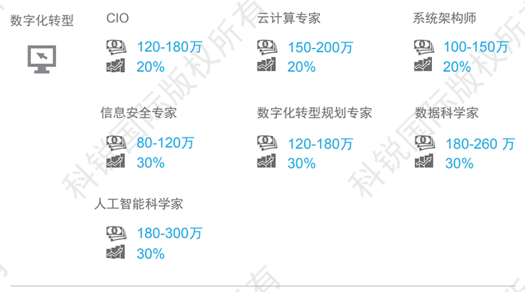 数字化转型这几年不断是招聘的热门领域,在数字化转型相关技术岗位里,需求增长位列前三的分别为:云计算、系统架构和人工智能。在云计算领域里涉及的岗位中,分布式计算、信息安全也是2020年度里招聘需求增速较快的岗位之一。